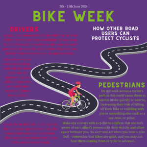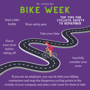 • Distribute Bike Safety information: If some employees within your organisation cycle, either for work or leisure purposes, take time this week to construct and distribute resources such as leaflets, or a short video on key safety principles for cycling.